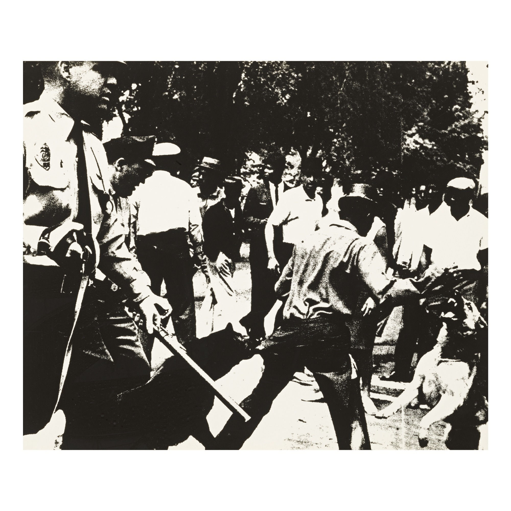 Presenting a pivotal moment with the  American Civil Rights Movement, Warhol took the image from LIFE Magazine that shows the misinformation surrounding the movement.  Contextually, after the Birmingham Truce Agreement was made to begin partial desegregation of public spaces in Birmingham, Alabama, segregationists viciously bombed a motel closely connected with integration leaders as well as the home of Martin Luther King Jr.’s brother, Alfred Daniel King.
