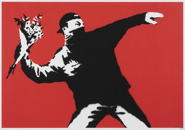 Eros is a primal love that comes as a natural instinct for most people. It’s a passionate love displayed through physical affection. These romantic behaviours include, but are not limited to, kissing, hugging, intimacy and holding hands. This type of love is a desire for another person’s physical body. Flowers, a common romantic gift, carry with them a weight of symbolism and appreciation and can be seen as an expression of romantic love. Whilst being associated with the Israel Palestine conflict the image itself in Love is in the Air is universal. We can all relate to feelings of romance, of small little gestures and gifts to show our appreciation for our partner much like the bouquet held in the hands of the protagonist of the piece. Visually, the work is characteristic of the artist’s street stencil graffiti style and, in typical Banksy aplomb, features a contrasting image that can be interpreted as playful as well as more serious. Central to the image the figure, silhouetted in black and dressed as a militant, wears a baseball cap and bandana to disguise their identity in a pose commonly associated with the throwing of a petrol bomb. However, the “Banksy twist” reverses this notion as the figure throws a bouquet of flowers. Would Eros approve? Maybe not to the violent interpretation of the gesture but potentially to the romantic gesture itself.